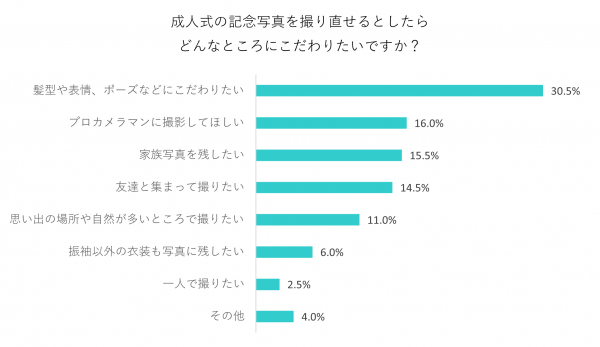 「髪型や表情、ポーズなどにこだわりたい」30.5%、「プロカメラマンに撮影してほしい」16%、「家族写真を残したい」15.5%、「友達と集まって撮りたい」14.5%、「思い出の場所や自然が多いところで撮りたい」11%、「振袖以外の衣装も写真に残したい」6%、「一人で撮りたい」2.5%、「その他」4%でした。