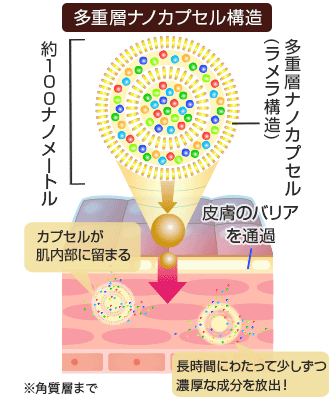 そこで、ラップリフト ネッククリームは、人間の表皮と同じラメラ構造をしており、肌との親和性が高いナノサイズのカプセルに成分を閉じ込める事で、深い浸透力2※を実現しました!