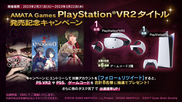 キャンペーンにエントリーして、「Amata Games」、『オノゴロ物語 〜The Tale of Onogoro〜』、『Last Labyrinth』の公式アカウントをフォロー、該当ツイートをリツイートすると、PS VR2やPS5、対象ゲームのDLコードなど、豪華賞品を合計8名様に抽選でプレゼントします。さらに他のタスクをクリアすると当選確率がUPしますので、ぜひチャレンジしてください。