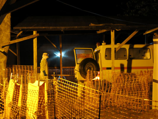 何時間もかけて患者を運んできた救急車。すでに亡くなっている患者がいたり、無症状なのに親と一緒に乗せられてくるこどももいる。(C)Hiroyuki Kato/MSF