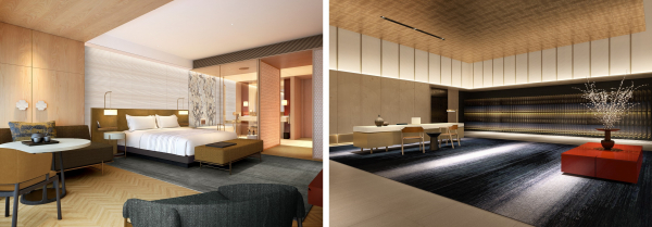 施設内の客室、パブリックスペース、ザ・ロビーラウンジ&バー、カフェ、クラブラウンジ、スパのインテリアデザインは、オーストラリアのメルボルンに拠点を構えるLAYAN Architects + Designersが手がけました。ホテルのデザインは、国の伝統的工芸品に指定され、日本三大織物の一つでもある「博多織」からインスピレーションを受けており、糸を紡ぎ "織る "という発想でホテル全体を繋ぐ共通したストーリーで形成されています。