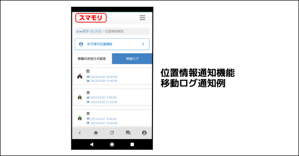 位置情報通知機能により、忙しい保護者の方も手間なく簡単にお子様の位置情報を確認できるだけでなく、設定場所の出入りのログが残ることで、いつもと違う行動があれば危険から守る手助けとなり、保護者もより安心できる機能となっております。