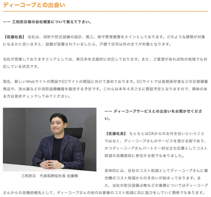 ディーコープ株式会社(本社:東京都中央区、代表取締役社長:萬田吉寛、以下ディーコープ)は、2023年3月30日にディーコープWebサイト内「買い手企業インタビュー」に新しいインタビューページを追加いたしました。今回は弊社のDX推進サービスである「DXコンシェルジュ“DeeX Online Counter”」や弊社のベースとなるコスト削減サービスについて、ディーコープのお客様である三和防災株式会社の視点から語られます。ディーコープのサービスやプロジェクトの進め方を多くの方に見ていただければと考えております。今後もお客様のインタビューを追加していく予定ですので、どうぞご覧になってください。