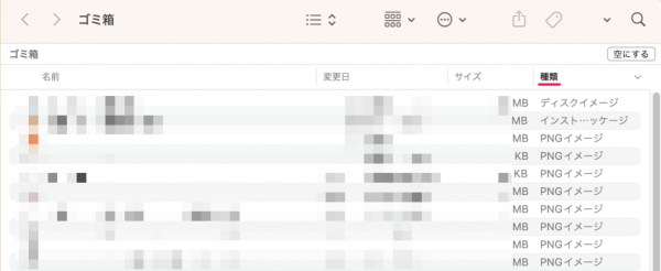 (2)ごみ箱の中から、削除されたメールファイルを「種類」から並び替えて探します。メールファイルは通常、.eml、.msg、または.pstなどの形式になっています。