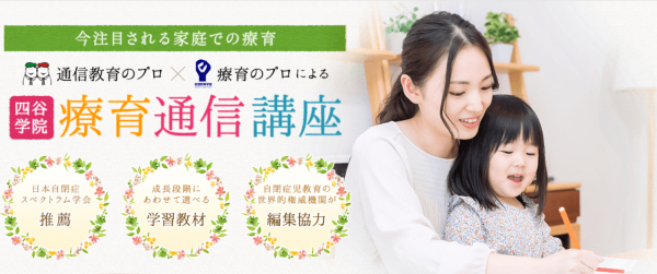 四谷学院が運営する「療育55段階プログラム講座(55レッスン)」は、発達障害の自閉症児の療育に50年以上の実績と高い信頼を誇る「学校法人武蔵野東学園」の編集協力によって作成された、ご家庭で楽しく療育ができる通信教育講座です。また、「発達障害児ライフスキルトレーナー資格認定講座」は、「ライフスキル」(地域社会の中でスムーズに暮らしていくためのスキルの総称)を身に着ける、一人ひとりのお子様に適したトレーニング方法を保護者自身に見つけていただくための講座です。