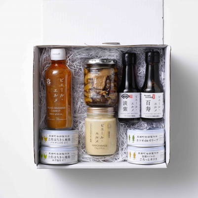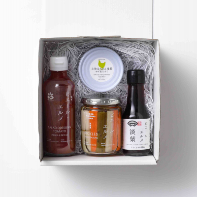 食卓に出すだけで様になる「ピクルス 愛媛ミックス」や、トマトの旨味が凝縮された「トマトドレッシング」、おつまみやいつもの料理のアクセントとして活用できる「缶詰 土佐はちきん地鶏 ゆず塩仕立て」、米麹由来のまろやかな甘みをもち、「つけ醤油」「かけ醤油」としてあらゆる料理にお使いいただける「淡口醤油 淡紫」をギフトボックスに詰め合わせました。