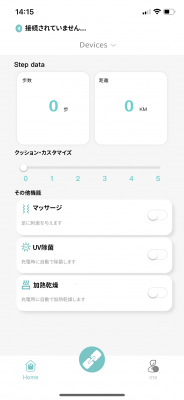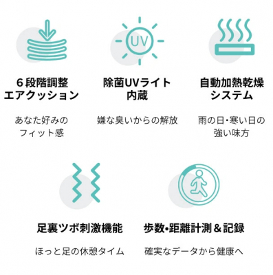 歩数や距離のデータ確認はもちろん、エアクッションのコントロールや足裏のツボを刺激するマッサージ機能、UV除菌機能と加熱乾燥機能など、全ての操作を同画面から操作でき、簡単操作に優れたUIを採用しています。