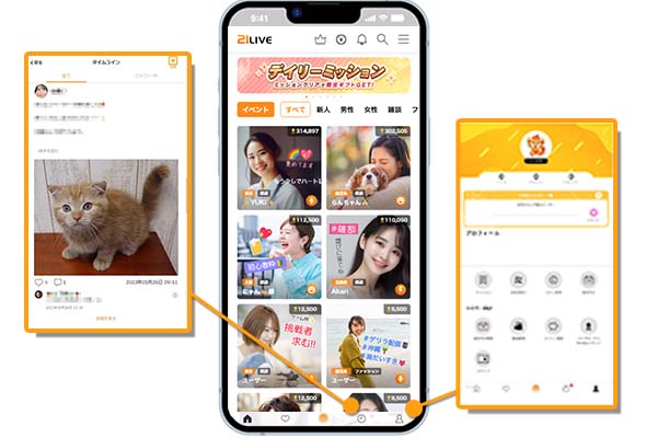 21LIVE=「思い通りの“人生”が、ココから始まる」古代数秘術において「21」とは人生が思い通りになっていく状態を表すエンジェルナンバー。「LIVE」は英語で人生を。なりたい自分になれる配信場所、それが21LIVE!
