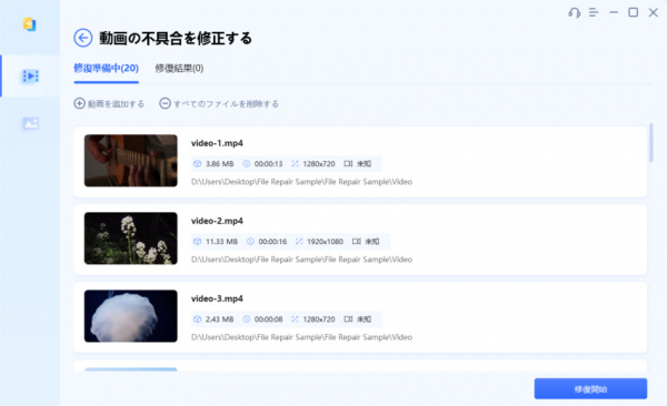 破損した動画を追加したら、「修復開始」ボタンをクリックし、修復プロセスを開始します。修復した動画に問題がなければ、各動画の「エクスポート」ボタンをそれぞれクリックするか、「すべてエクスポート」をクリックしてすべての動画を一度にパソコンに保存することができます。