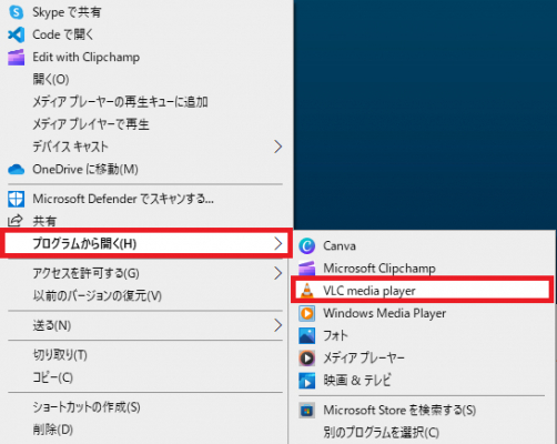 2.再生したい動画ファイルを右クリックし「プログラムから開く」→「VLC media player」の順番にクリックすると、動画を再生できます。