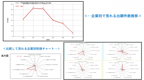 ・図から企業ごとの性格チャートや出願件数推移が読み取ることができる