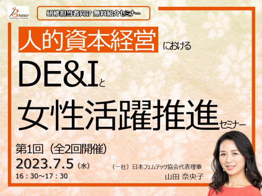 人材育成コンサルティング事業を手掛ける、Brew株式会社(所在地:東京都中央区銀座7丁目13番6号サガミビル2階、代表取締役:原 佳弘)は 、一般社団法人日本フェムテック協会山田奈央子代表理事による「人的資本経営におけるDE&Iと女性活躍推進」オンラインセミナーを7月5日(火)と12日(火)に開催いたします。