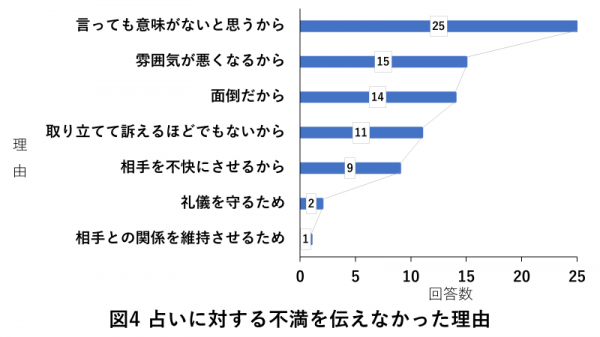 占いに対する不満をなぜ伝えなかったのか。その理由としては「言っても意味がないと思うから」との回答が最も多くみられました。