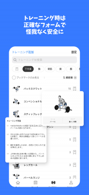 ライブラリー機能では、合計300個以上の運動が登録されており、動画と文章で正しい運動方法を知ることができます。