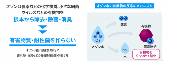 オゾン水は、アルコールよりも除菌効果が高く、地下鉄サリン事件、東海村の臨界事故、福島原発事故の除染、ウイルス等の除染にも使用されています。オゾン水は、化学物質など小さなものを分解して水と酸素に戻るので廃液処理も楽です。そのほかにも、水道局で水道水の処理、歯科医院の器具の消毒、食品工場で食品添加物として使用されています。また、医療でもオゾン療法として皮膚疾患の患者さんに使用されることもあります。