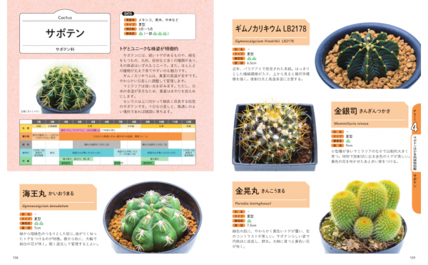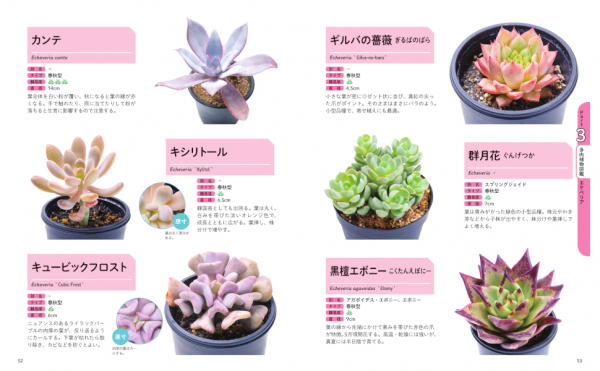 さらに新しい品種や人気品種、サボテンやコーデックスなど、園芸店で購入可能な300種以上を図鑑で紹介しています。