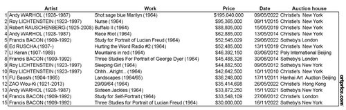 Top 15 auction prices for artworks produced in 1964