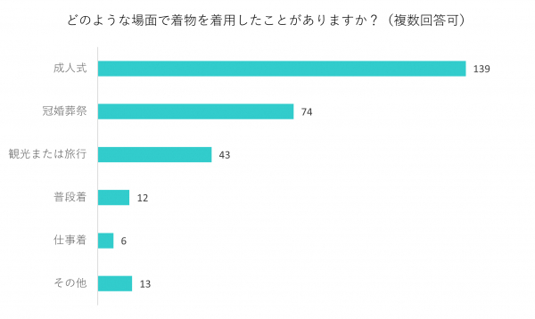 最も多かったのは「成人式」で139票でした。次いで「冠婚葬祭」74票、「観光または旅行」43票、「普段着」12票、「仕事着」6票と続きます。「その他」の回答には、「大学の卒業式」「日本舞踊のレッスン」「子供のお宮参り」などがありました。