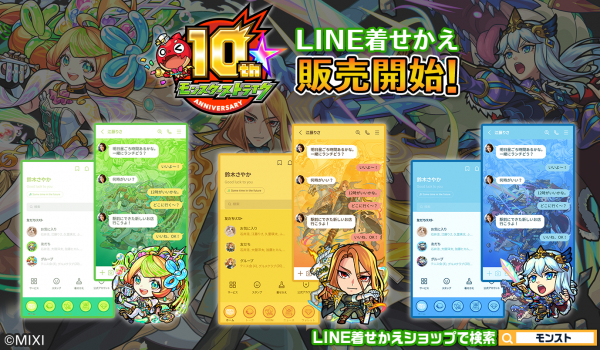 株式会社インクルーズ(東京都渋谷区、代表取締役社長 山? 健司)は、LINE株式会社(東京都新宿区、代表取締役社長 出澤 剛)が運営するコミュニケーションアプリ「LINE」内の着せかえショップにて、株式会社MIXI(東京都渋谷区、代表取締役社長 木村 弘毅)が提供するスマートフォンアプリ「モンスターストライク」(以下、モンスト)のLINE着せかえ3点を2023年7月20日(木)に一斉配信致しました。