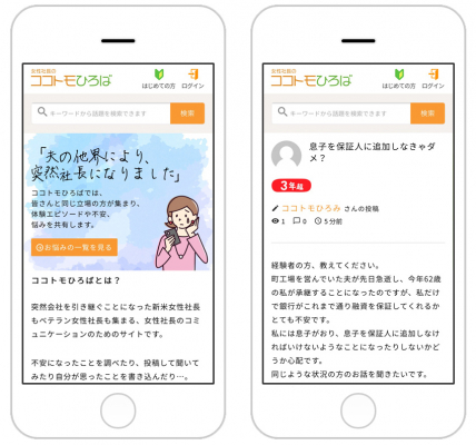 「女性社長のココトモひろば」は、女性社長.netとエヌエヌ生命保険株式会社が2020年1月24日より運営しています。先代経営者の逝去などで、突然会社を引き継ぐことになった新米女性社長もベテラン女性社長も集まる、女性社長のコミュニケーションのためのウェブサイトです。同じ境遇にある女性とお互いの悩みを分かち合ったり、事業承継を経験した先輩からアドバイスをもらったりなど、女性経営者の不安や孤独のケアができるウェブサイトを目指しています。
