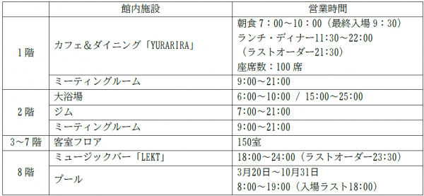 内覧会では、スタンダードな客室紹介のほかにアーティストが内装デザインした客室やB.LEAGUEバスケットボールチームの琉球ゴールデンキングスとコラボした客室、カフェ&ダイニング「YURARIRA」、サウナ付大浴場、ミュージックバー「LEKT」、プール、ミーティングルームをご紹介します。