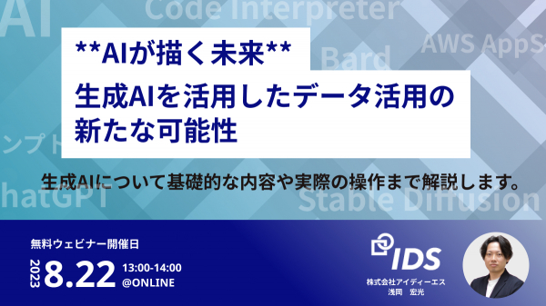 株式会社アイディーエス(本社:東京都港区、代表取締役:中野 貴志、以下アイディーエス)は、2023年8月22日に、「ChatGPT活用 AIが描く未来:生成AIを活用したデータ活用の新たな可能性」に関する無料ウェビナーを開催いたします。