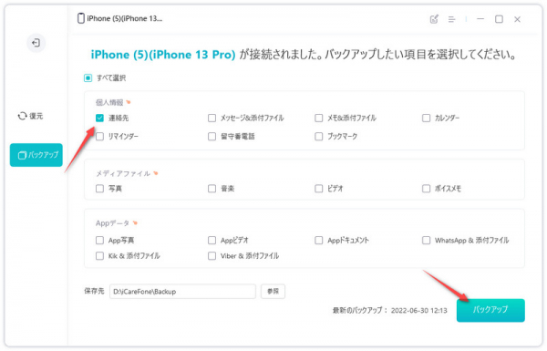 step2:移行するデータを選択し「バックアップ」をクリックします。しばらくすると、選択したデータがパソコンに転送されます。