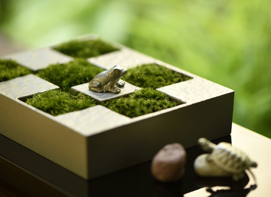 市松状の小さな池に見立て、蛙や亀などの小物や小石を置いてみると、よりスケール感を感じられますね。