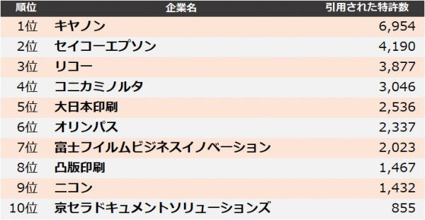 集計の結果、2022年に最も引用された企業は、1位 キヤノン、2位 セイコーエプソン、3位 リコーとなりました。