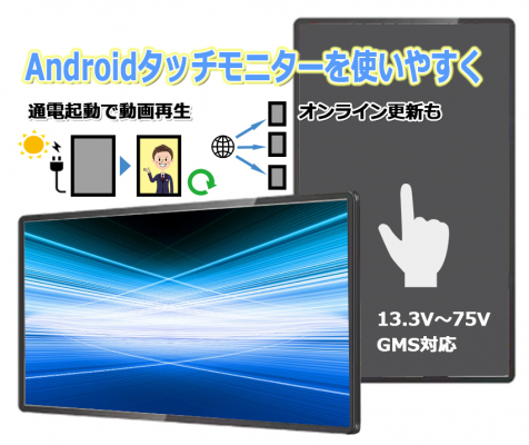 専用の動画再生アプリをAndroidタッチモニターに組み込むことで、モニターが通電し起動した後、事前に指定したフォルダ内のmp4動画を自動で繰り返し再生します。