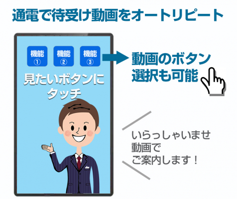 また、追加でプログラムの設定を行えば、複数のコンテンツをタッチ操作で切り替えて再生することもできます。これにより、目的やターゲットに合わせた効果的な情報発信が可能となります。
