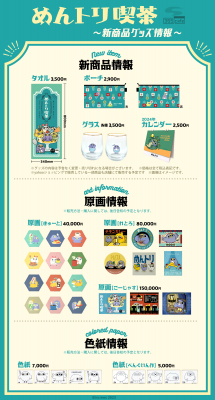 2022年に続き、2年連続での開催となる「めんトリ」の原画展及びコラボカフェが西武渋谷店にて行われます。店内で展示される「めんトリ」の「きゅーと」「れとろ」「ごーじゃす」なカラー原画イラスト21点(40,000〜150,000円)は【各1点のみ】で購入可能で、「めんトリ」作者直筆のイラスト色紙60点(各5,000円)も販売されてます。また、コラボカフェでは「めんトリ喫茶」限定の「コラボドリンク」と「コラボフード」もご用意しており、コラボ商品を注文していただいたお客様にはコースター、ランチョンマットをプレゼント!更にコラボメニューを含む店内飲食2,200円(税込)ごとにアクリルチャームを1個プレゼントいたします!こちらは数量限定となりますので是非お早めにお立ち寄りくださいませ!