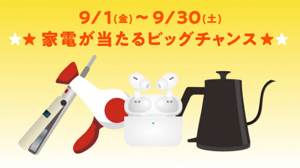 「☆★家電が当たるビッグチャンス★☆」では、1等のアップル AirPods Proが1名様に、2等のバルミューダ ザ・ポットが1名様に、そして3等では選べる!快適家電 が20名様に当たります!大好評の「抽選で『美味しいギフト』を当てよう♪」や『お店で使えるギフトクーポン抽選!』、『☆☆抽選で「図書カードネットギフト」が当たる☆☆』の3企画は9月も継続して開催します。定番の「Amazonギフトカード抽選」と「楽天抽選」も含め6企画を毎日開催しますので、ぜひ抽選に参加して豪華景品をゲットして下さい。
