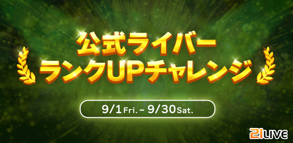 【21LIVE】全ライバーにランクアップのチャンス!「公式ライバーランクUPチャレンジ」9月1日より開催☆TOP21に入って10月は1Rank up!NO.1ライバーはなんと2Rank up!