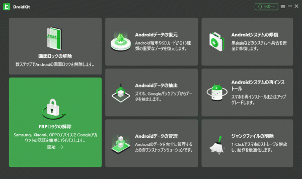 このような場合には、DroidKitの「FRPロックを解除」機能を利用することをおすすめします。DroidKitを使用すると、Googleアカウントのパスワードなしで、自宅で簡単にGoogleアカウントロックを解除することができます。