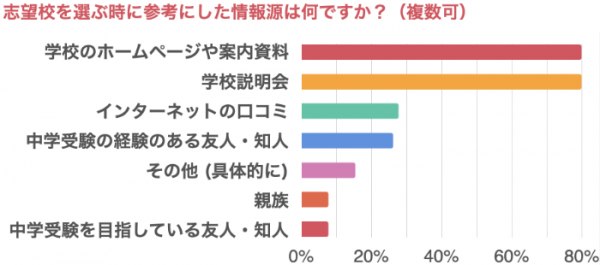 「学校のホームページや案内資料」、「学校説明会」が最も多く80%、「インターネットの口コミ」が28%、「中学受験の経験のある友人・知人」が26%、「その他 (具体的に)」が15%、「親族」が10%、「中学受験を目指している友人・知人」が8%という結果となりました。