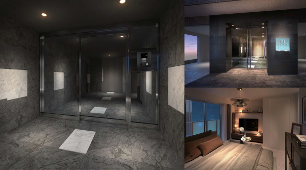 ホワイトとブラックを基調としモノトーンでまとめたスタイリッシュデザイン。2色のタイルの貼り分けとガラスパネルでファサードに個性を描き出し、洗練さと高級感が融合した街の新しい象徴を創出。住まう人の誇りを満たす、堂々たる装いのレジデンスが誕生しました。