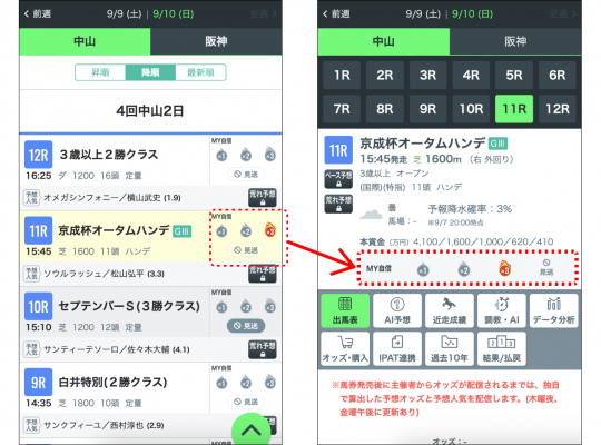 今回のリニューアルに伴い、各競馬場1〜12レースまで人気馬や1着馬を一覧で見ることができ、概要把握のタイパ向上につながります。また、MY自信度や見送りの記録が、どのレースで馬券を購入したらよいかなど、レース選びの際に判別できるようになります。ほかにも、予想したいレースが荒れやすいかなど、投票したレースの的中結果を一覧で把握できるようになります。