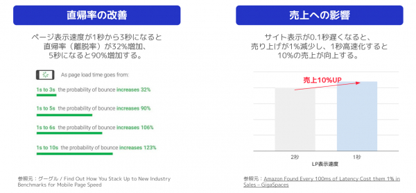 LPの表示速度はCVRにに大きく関わります。実際に、表示速度が1秒から3秒になると直帰率(離脱率)が32%増加し、5秒になると90%増加するとも言われています。また、表示速度を1秒高速化すると10%の売上が向上するため、サイト設計において表示速度の改善は必須と言っても過言ではありません。