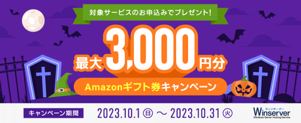 Winserver(ウィンサーバー/運営会社:アシストアップ株式会社、所在地:大阪府大阪市、代表取締役:青木 勝彦)は、2023年10月1日(日)〜10月31日(火)の期間、Amazonギフト券キャンペーンを実施いたします。