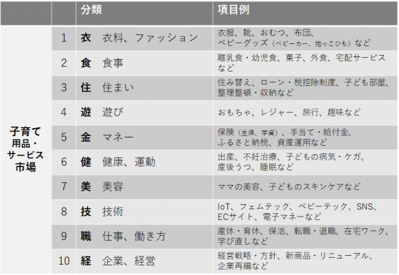 今回我々は、妊活中の女性、妊婦さん、乳幼児(〜3歳頃まで)を育てるママパパを念頭に、彼らの今の思考、消費・行動様式を整理することから、2023年度下期に流行するであろう商品やサービスを挙げることにしました。詳細は以下の通りで、「衣」「食」「住」「遊」「金」「健」「美」「技」「職」「経」の10視点から、各々予測しています。