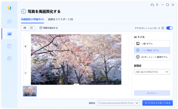 (2)「写真の追加/ドラッグ」ボタンをクリックするか、ドラッグ&ドロップの機能を使用して、高画質化したい写真を追加します。その後、使用したいAIモデルと解像度を選択します。