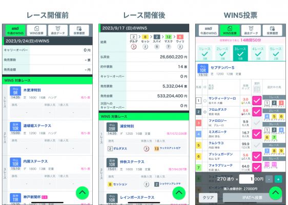 今回、SPAIA競馬を使って WIN5 投票ができるようになったほか、対象レースごとにページを開かなくても出走馬やオッズなどの情報を一画面で表示できるようになりました。以前より、見やすさ、使いやすさを追求し、操作性を重視した WIN5 投票機能で、簡単に競走馬選択や IPAT への投票が行えます。また、過去データや投票履歴などの情報が充実し、自身の WIN5 収支管理も可能になります。