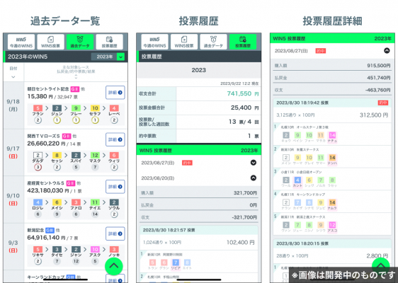 WIN5 用の投票状況(収支合計、投票額、的中票数、自分の投票履歴)を確認できます。