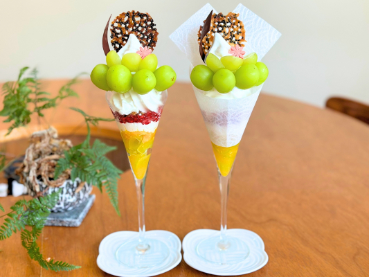 和式婚礼の花嫁姿をイメージした“ハレの日”パフェ。シャインマスカットをたっぷり使用した贅沢パフェは、特製ソフトクリームは濃厚なのにさっぱり!
