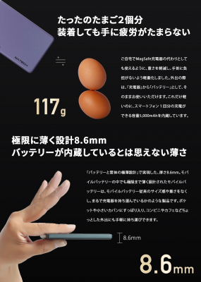 スマートフォン・タブレット関連製品を主に企画開発する京都のクリエイティブブランド、MATECH株式会社は2023年9月26日、世界最薄、厚さたったの8.6mm、バッテリー兼充電器「MagOn 5000」を発売致しました。(URL:https://www.amazon.co.jp/dp/B0CBSH3XC5 ) Amazon.co.jpでの価格は税込み5,990円(2023年9月26日時点)です。
