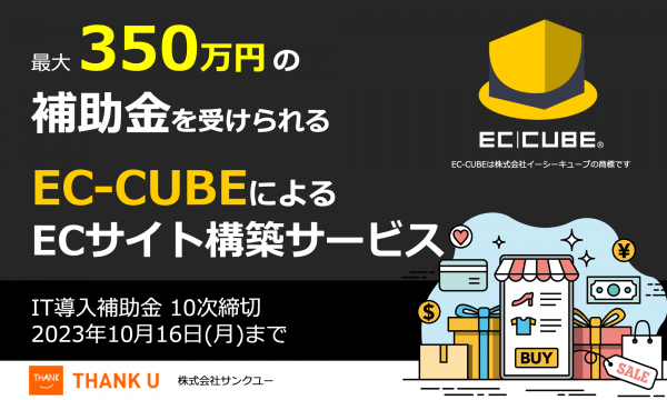 株式会社サンクユー(東京都品川区、代表取締役社長:堀川治)は、2023年10月2日、最大350万円のIT導入補助金の交付申請が可能な「EC-CUBEによるECサイト構築」10次締切分を開始いたしましす。