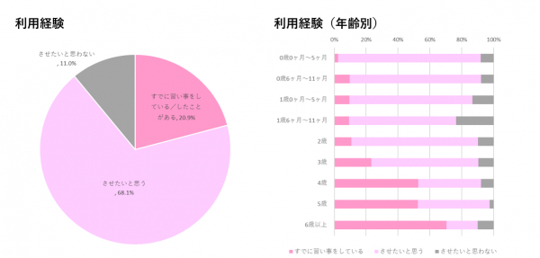 調査結果から、子どもに習い事を経験させた人、これから経験させたいと思っている人は約9割に上ること。検討開始と実際に開始した時期には、0歳と2〜3歳の2つのピークがあることがわかった。