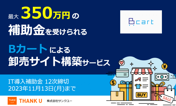 株式会社サンクユー(東京都品川区、代表取締役社長:堀川治)は、2023年10月30日、最大350万円のIT導入補助金の交付申請が可能な「Bカートによる卸売サイト構築」12次締切分を開始いたします。