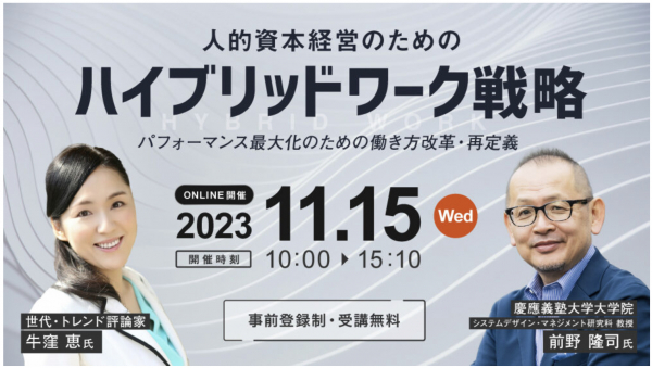 「人的資本経営のためのハイブリッドワーク戦略〜パフォーマンス最大化のための働き方改革・再定義〜」では、ウェルビーイングの研究で著名な慶応大学大学院の前野教授が社員の幸福度を高める働き方について講演をされます。